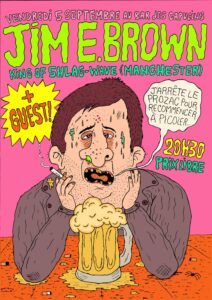 shlig & shlag présentent JIM E. BROWN Son nom est Jim E. Brown, il a 19 ans, plus de 10 albums à son actif, et plus de litres de Guinness au compteur dans le gosier qu’un alambic de la taille de l’Ohio. Sorte d’enfant illégitime des Kinks et de Charles Bukowski, il nous vient tout droitaaa